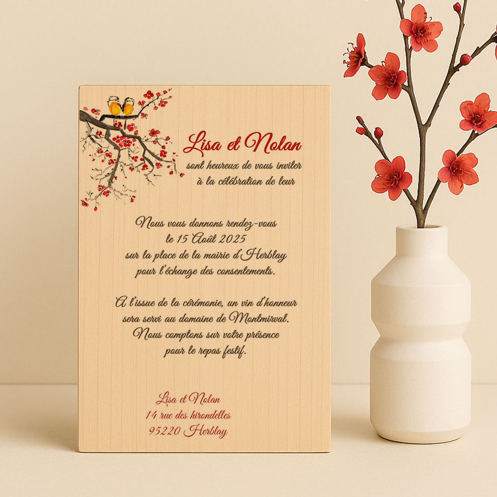 Les faire-parts sont réalisés sur des planches de bois naturelles. La nature étant ainsi faite, chaque pièce est unique et de sensible variation sont visibles d’un faire part à l’autre.